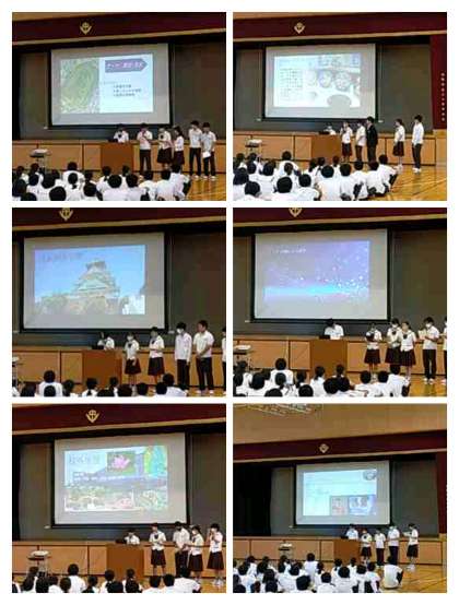 ○6月に実施した校外学習の発表会を行いました。学級で選ばれたグループ一つが学年生徒全員の前で堂々と発表をしました。