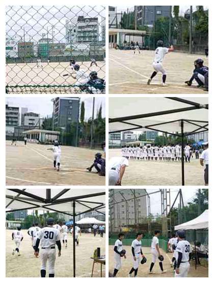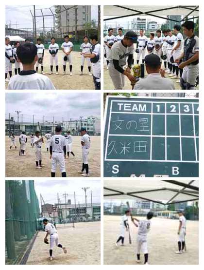 ○新生野中学校にて、久米田中学校と試合をしています。1回表に相手失策にじょうじて、2点を先制しました。