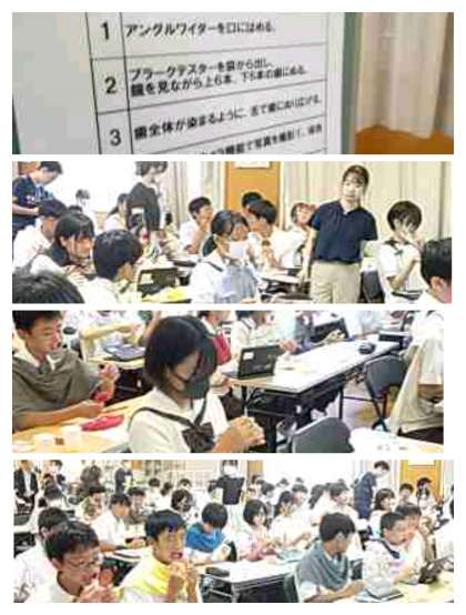 ○学校歯科医さん、歯科衛生士さんにお越しいただき歯の染め出しを行いました。人生100年時代、歯肉炎を予防するために、しっかり歯を磨きましょう。
