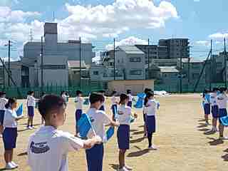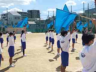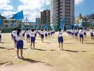 ○体育大会の学年演技の練習です。今年はフラッグパフォーマンス。青空に生徒たちが描くブルーフラッグの軌跡が観る人を感動させます。