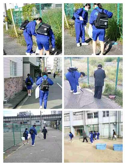 ○土曜授業で恒例の地域清掃を行いました。地域の方もたくさん参加されていました。袋いっぱいにゴミを拾ったグループもありました。