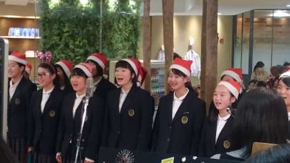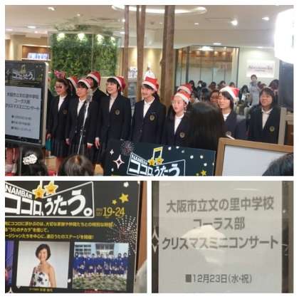 23日(水祝)に、難波高島屋5階ローズパティオにて、コーラス部がクリスマスミニコンサートを行いました。発足から、8ヶ月弱ですが着実にその歌声は力を増してきています。買い物客の皆さんも足を止め、清涼感あふれるクリスマスソング他に、聞き入ってました。