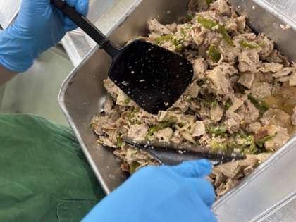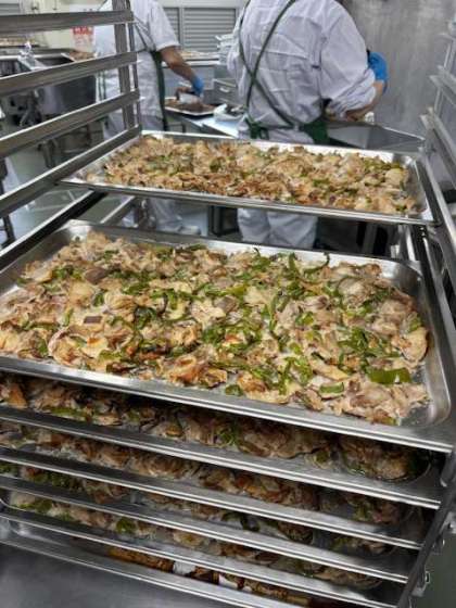 豚肉は、ワイン、塩、こしょう、ガーリック、こいくちしょうゆ、綿実油で下味をつけてピーマンを合わせて、焼き物機で焼いています。