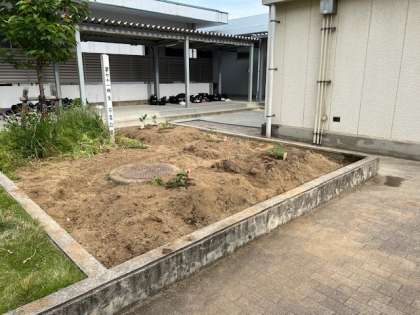 中庭の卒業記念樹が植えられている花壇の一角に、ミニ菜園が誕生しました。