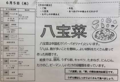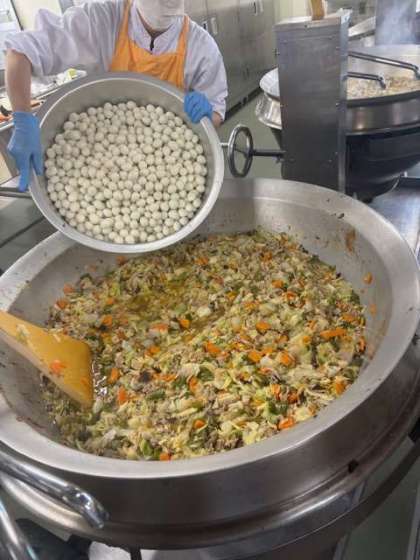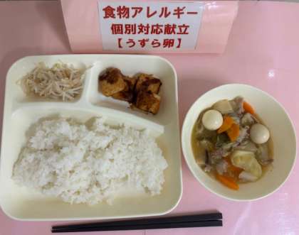 今日の給食の「八宝菜」は卵の除去食対応献立です。給食室で、うずら卵を入れる調理の最終段階で除去食分をとり、提供しています。