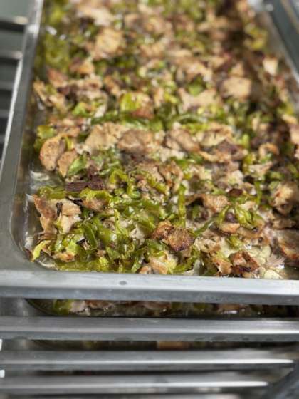 ? 今日の給食の「豚肉の梅風味焼き」は梅肉、砂糖、料理酒、こいくちしょうゆ、綿実油で下味をつけた豚肉に、ピーマンを加えて混ぜ合わせて、焼き物機で焼いています。