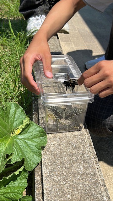 中庭で、アゲハ蝶2匹が3年生の生徒たちに見送られて虫かごから飛び立ちました。