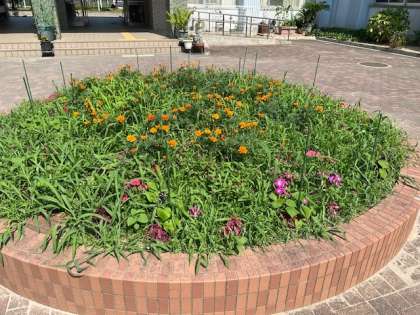 レンガで組まれた円形花壇は、その区切り模様まで輝きを取り戻し……