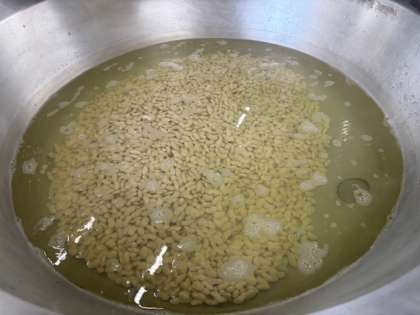 今日の給食の「大福豆の煮もの」は釜で調理をしています。