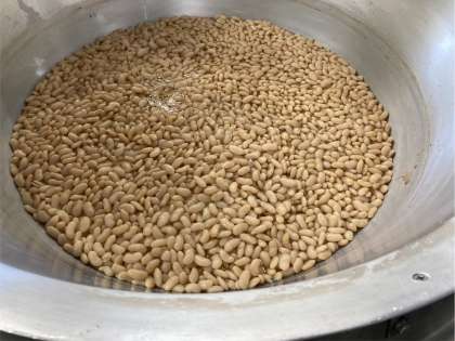 大福豆が柔らかくなれば、砂糖で味付けをして煮含め、塩、うすくちしょうゆを加えてに煮て、火をきってしばらく味を含ませています。