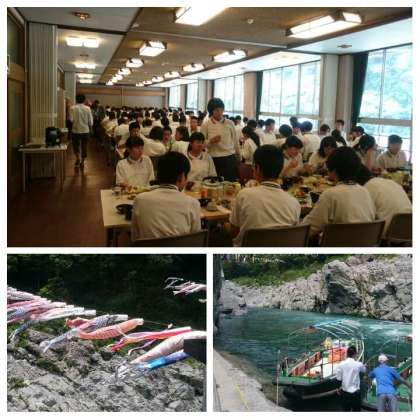 その中心にある「まんなか」という、お店で昼食をとりました。その横を、吉野川が流れ空には、名物の鯉のぼりが、元気に泳いでいました。午後は、ラフティングと遊覧船に別れて、四万十の自然を体験します。