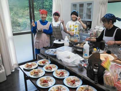 みんなで食事づくりの班、それぞれの時間を過ごしています。、