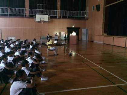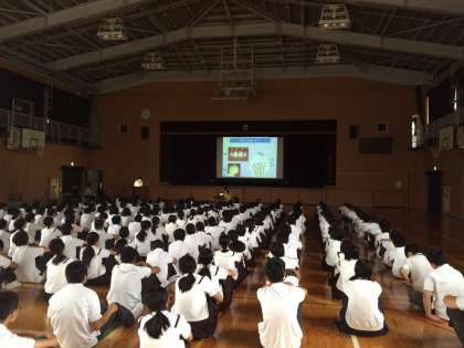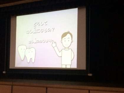 2時間目は1年生を対象に「歯と口の健康教室」です。歯科衛生士さんがパワーポイントをまじえながら丁寧に説明してくださいました。虫歯をなくそう!!