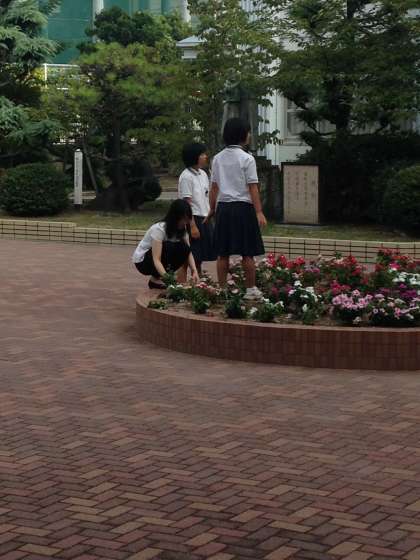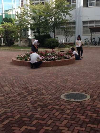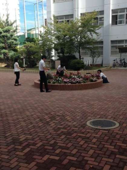 一学期に手入れした花壇を、綺麗に保つため、3年の女子が朝から雑草を抜いてくれてます。何時もありがとう。