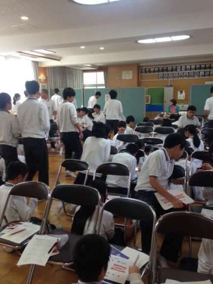 今日は二年生対象に歯肉炎予防啓発講座が開かれました。みんなは、家から使い慣れた歯ブラシを持ってきて歯を磨き特殊な塗料で磨き残しを確認。その後、正しい磨き方の講習を受けました。