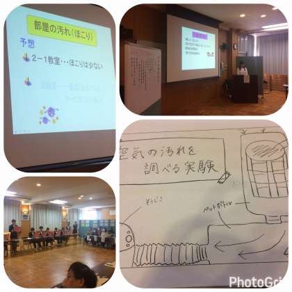 「感染症を予防しよう」をテーマに、保健委員の2年生の生徒たちが、実験などをし調べたことを発表してくれました。