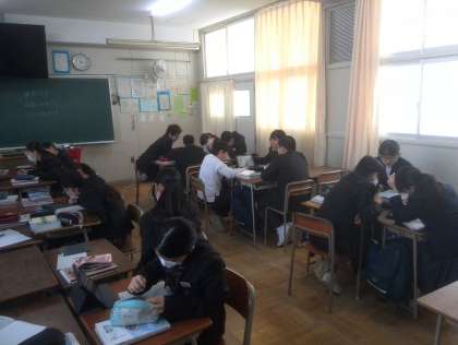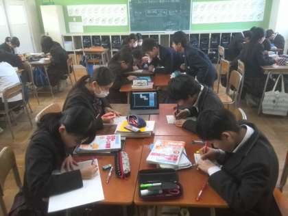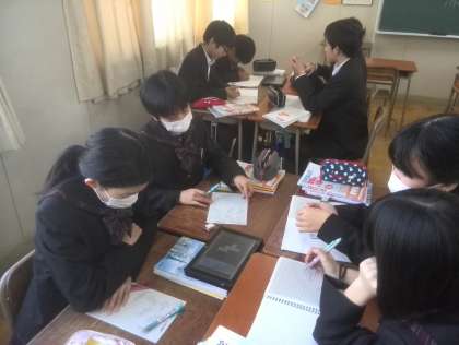 1年6組の3限。数学にて「立方体の展開図はいくつあるか?」という問題に取り組みました。グループで試行錯誤しながら、タブレットを用いて調べました。