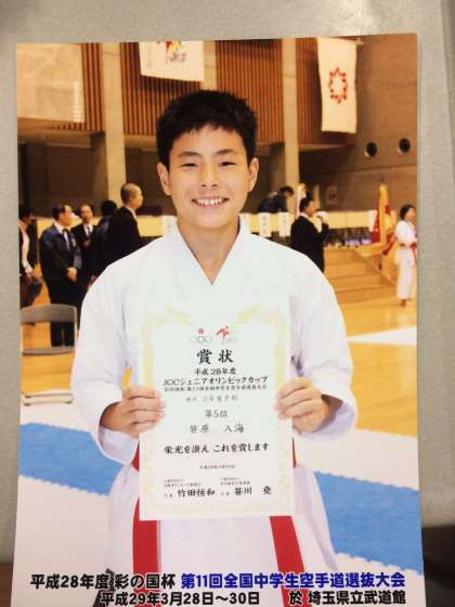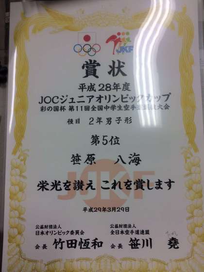 本校3年生、笹原八海さんがJOCジュニアオリンピック、全国中学生空手道選手権大会で第5位に入賞しました!