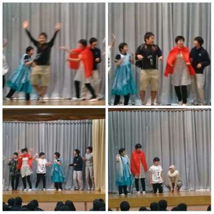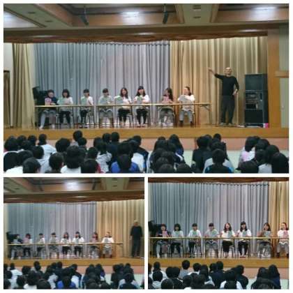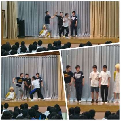 続いて、女子ハレーボール部、強引な引っ張りで、近藤先生も飛び入り参加しました。続いて、コーラス部。そこには、なんと岸先生も合いの手を入れに出演しました。日頃、学校では見れない先生の一面を垣間見て、一同で驚きと(笑)に包まれました。続いて、男子ベレーボール部による熱演。この発表の練習のために、本業のバレーボールのトレーニングが・・心配です。(笑)