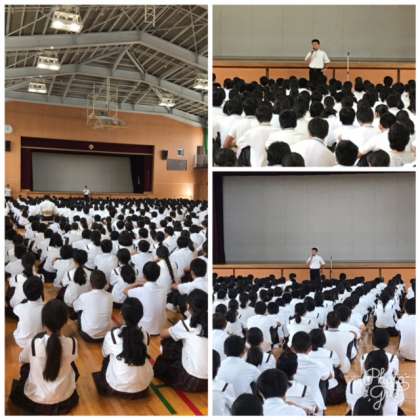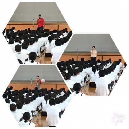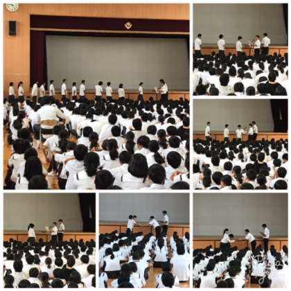 校長先生からUSJの人材育成をもとに、何事にもチャレンジする。そして初心を忘れない、との話をしていだだき、始業式が始まりました。各先生方から、夏休みの事、二学期からの事の話の後、夏休みに大会、発表会で活躍した部活動の表彰がありました。大会優勝や、選抜選手に選ばれたり、みんな良く頑張りました。特にコーラス部は大阪府下45校の中で二校の金賞に選ばれ、9月2日に近畿ブロック大会に出場です。ここでも金賞を取ると東京で全国大会です。是非頑張ってください。