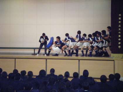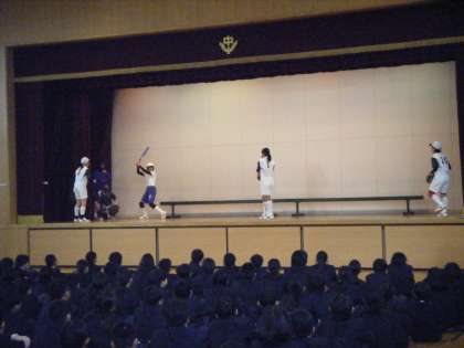 9日(水)の放課後、運動部文化部それぞれの上級生代表が、新1年生の獲得に向け、部活動紹介を行いました。どの部も趣向を凝らした内容に、1年生達もしっかりと見入っていました。ぜひとも、運動部文化部にかかわらず、どこかの部に籍を置いてほしいものです。