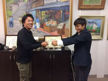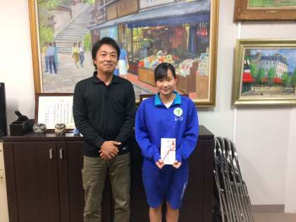 先日、PTA金谷会長より、全国大会出場のコーラス部部長さんと、ラグビーで大阪府中学校選抜に選ばれた藤田さんにお祝いが手渡されました。