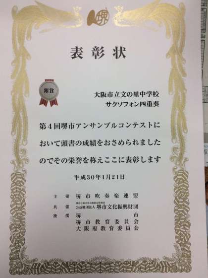 サックスチームはアンサンブルに取り組み、堺市吹奏楽連盟主催の大会に出場させていただきました。