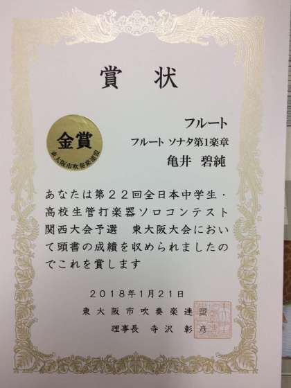 亀井さんはフルートの暖かい音色とスピード感溢れる演奏で見事、金賞を受賞!!