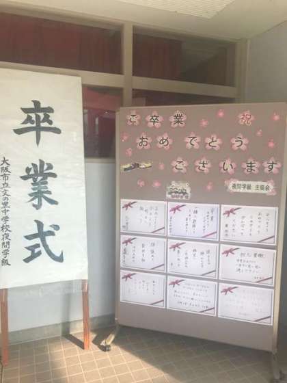 昨年は卒業式に参加される方が居なくて卒業式は無かったのですが、今年の卒業生は2名。お一人は体調を崩しておられて欠席されますが、本日18時より体育館で卒業式が行われます。本校では昼と夜の生徒間の交流が行われています。昼と夜の生徒間のメッセージ交換をしたカードが入口に掲示されています。