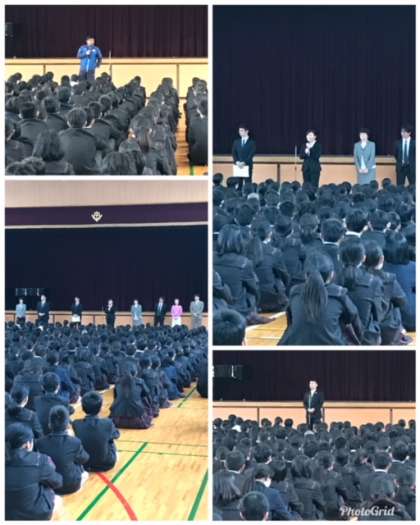 体育館ではまず、校長先生が新しく着任した先生方の紹介をしてくれました。そして3つの大切なキーワードと、生活指導の正木先生からは2つの魔法のキーワードで、二人で5つの言葉をもらい、充実した一年を過す方法のヒントをもらいました。