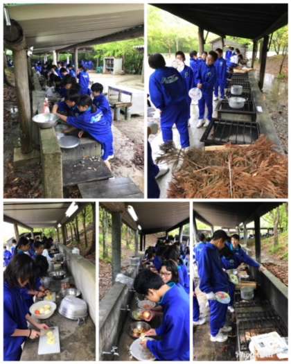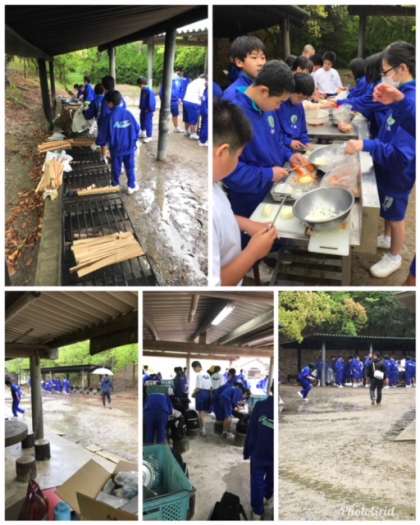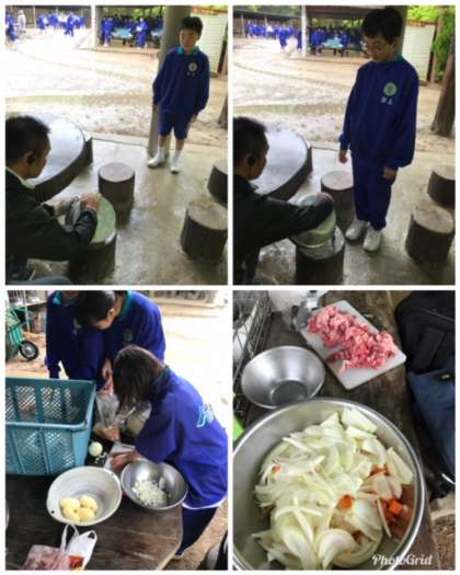 小雨の中、飯盒炊飯のカレー作りが始まりました。
