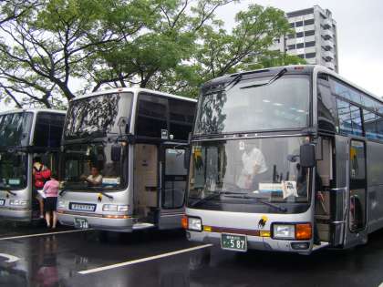5時間7分の乗車時間・・鹿児島中央駅到着。残念ながら大阪では降っていなかった、雨が途中から降りだしました。生徒たちは、さほど疲れた様子もなく、三日間お世話になる各クラスのバスに乗り込みました。