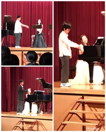 途中で3名の仲間が舞台に上がり三拍子や四拍子で指揮をして歌やピアノ、バイオリンの演奏をリードしてくれました。動きがロボットの様で皆んな大受けでした。