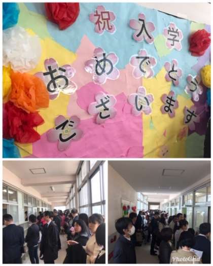 教室で中学校で初めてのホームルーム。廊下には在校生の作ったお祝いボードが掲示されていました。保護者の方も沢山来てくれて、教室に入れず、廊下からの見学です。いつも沢山の保護者の方が来てくれます。本当にありがとうございます。