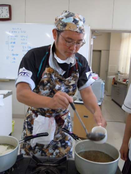 部員たちが懸命にパンをつくっている横では、先生がクラムチャウダーとコンソメの2種類のスープを。