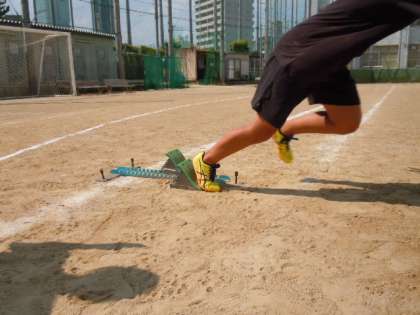 上)スターティングブロックを使って、スタートダッシュの練習です