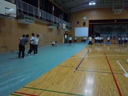 上)体育館の準備(シート敷き)です