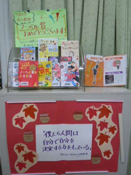 上)全校集会で校長先生からのお話にあったノーベル賞の特集コーナー。