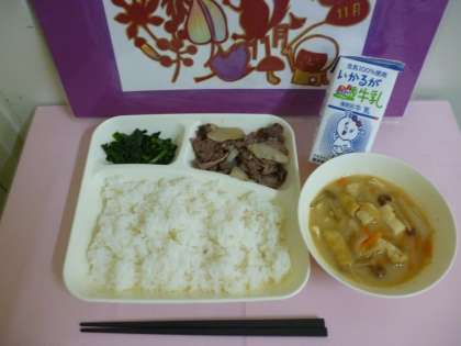 給食ではなめこのつるんとした食缶が楽しめるよう、豆腐やねぎなどと組み居合わせ温かいみそ汁に仕上げました。