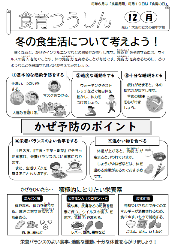 本日、12月号「食育つうしん」「食で給食を考えましょう」を