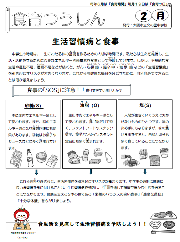本日、2月号「食育つうしん」「食で給食を考えましょう」を