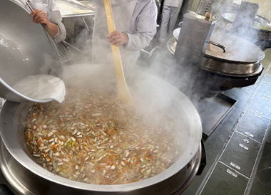 『うすくず汁』は、だしこんぶ、かつおぶしでだしをとり、鶏肉、はくさい、だいこん、にんじん、しいたけ、青みにみつばを使用しています。じゃがいもでんぷんでとろみをつけているので、お汁の温度が冷めにくく、食べた後も体がぽかぽか温まります。