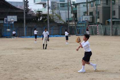 野球部では、1年生が2年生とボール回し練習をしていました。1年生、なかな上手でした。