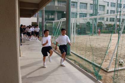 陸上部では、もも上げ練習。速く走る基本練習です。0.1秒でも速く走りたい…!