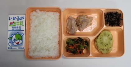 4月16日(火)、給食の献立は、鶏肉のしょうゆマヨネーズ焼き、れんこんの若草揚げ、小松菜とにんじんのあえもの、牛ひじきそぼろ、米飯、牛乳でした。