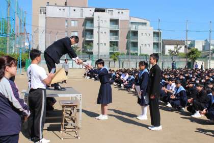 「大阪市春季総合体育大会第8ブロック大会」で、準優勝した女子バレーボール部の代表生徒に、校長先生から表彰状が授与され、生徒全員から大きな拍手で祝福されました。おめでとうございます!