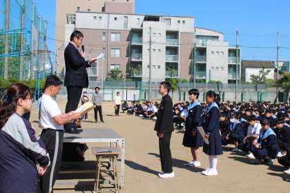 「第2回大阪陸上競技記録会」男子共通100mで第3位に入賞した3年Oさんに、校長先生から表彰状が授与され、生徒全員から大きな拍手で祝福されました。おめでとうございます!