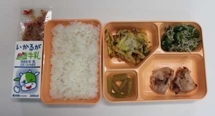 5月9日(木) 給食の献立は、鶏肉のレモンしょうゆ焼き、かきあげ、ピーマンとじゃこの炒めもの、ふきの青煮、米飯、牛乳でした。