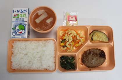 5月13日(月) 給食の献立は、てり焼きハンバーグ、マカロニサラダ、さつまいものバター焼き、ツナとほうれん草のソテー、オニオンスープ、米飯、牛乳でした。