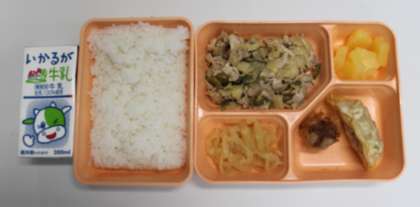 5月14日(火) 給食の献立は、回鍋肉、揚げ点心、だいこんのピリ辛あえ、パインアップル缶詰、米飯、牛乳でした。